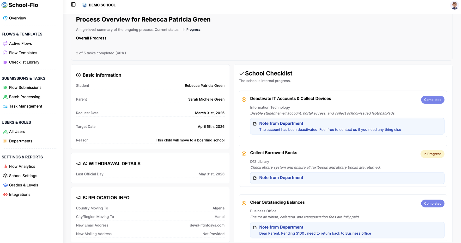 School Flo automates every student transition process - from withdrawals, graduation, onboarding and more - so no steps get missed and no team is left chasing paperwork.
